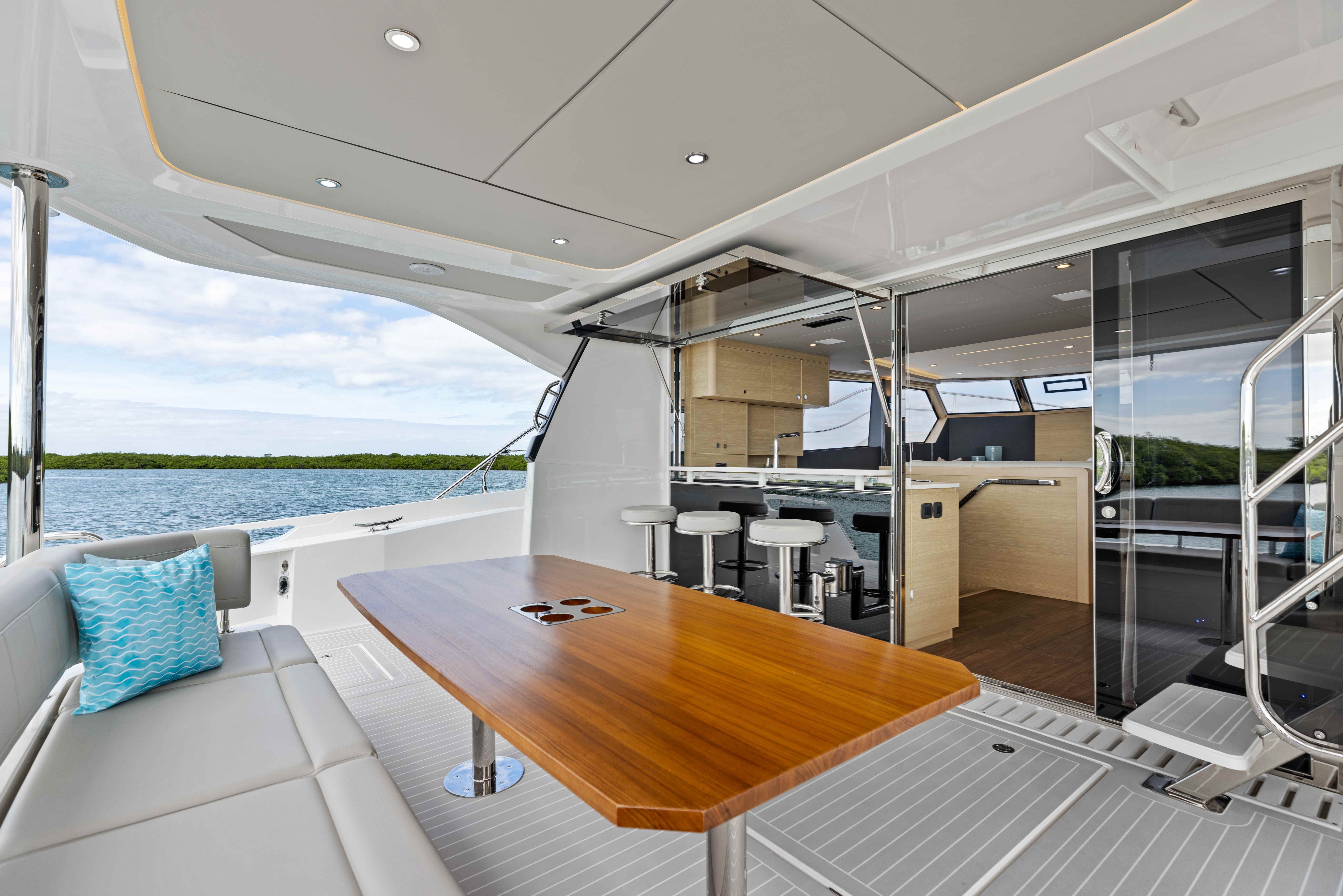Le flybridge, vaste et polyvalent, intègre un poste de pilotage central, un grand espace repas, un bar et des bains de soleil — parfait pour recevoir ou se détendre en mer. Le cockpit arrière, le salon intérieur lumineux et le lounge avant accessible complètent une disposition pensée pour maximiser le plaisir en navigation comme au mouillage.