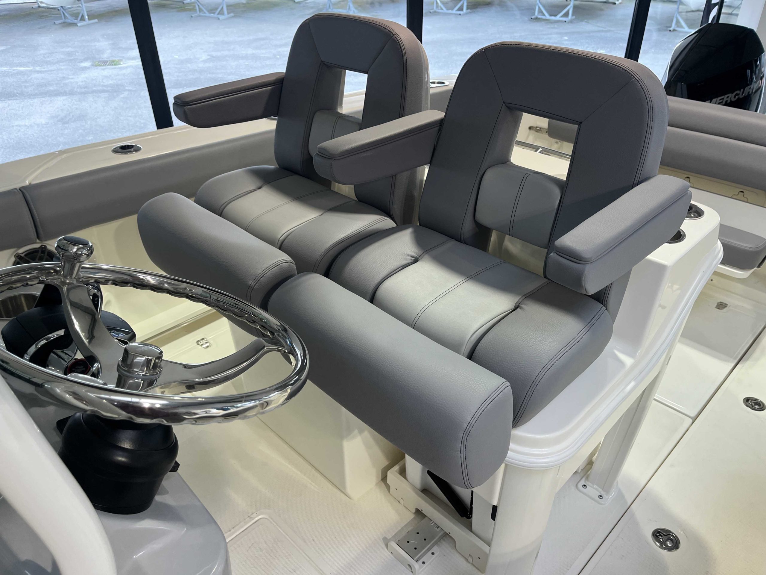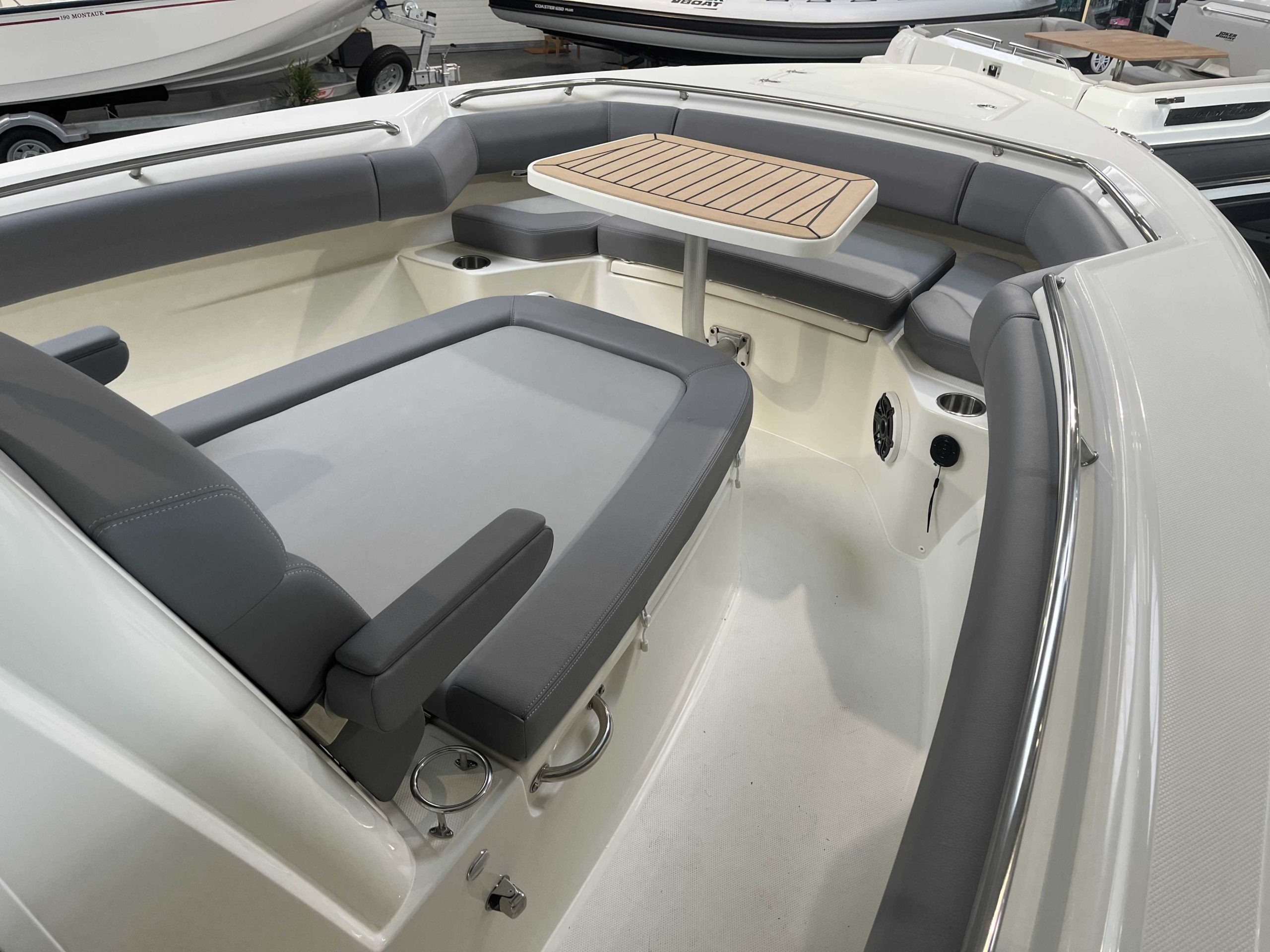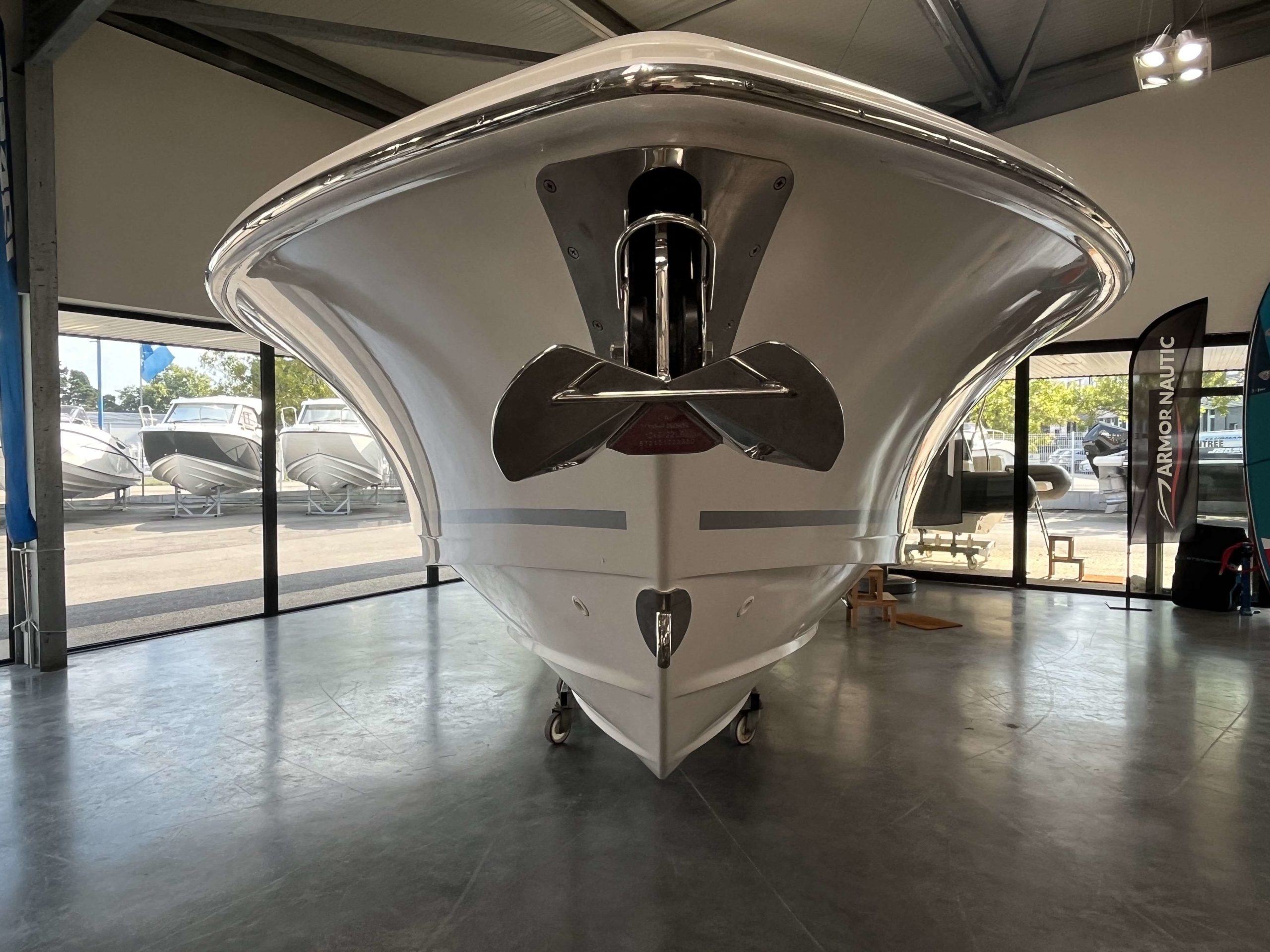 Anneau d'étrave, kit mouillage complet avec guindeau électrique chaîne et ancre inox, table de cockpit avant, premium package, leanning post deluxe avec glacière, vivier arrière babôrd, hardtop avec boitier électronique et essui glace, vesselview Mercury, système JL Audio, chargeur de batterie 220V, GPS Simrad NSX12 + sonde 3 en 1.