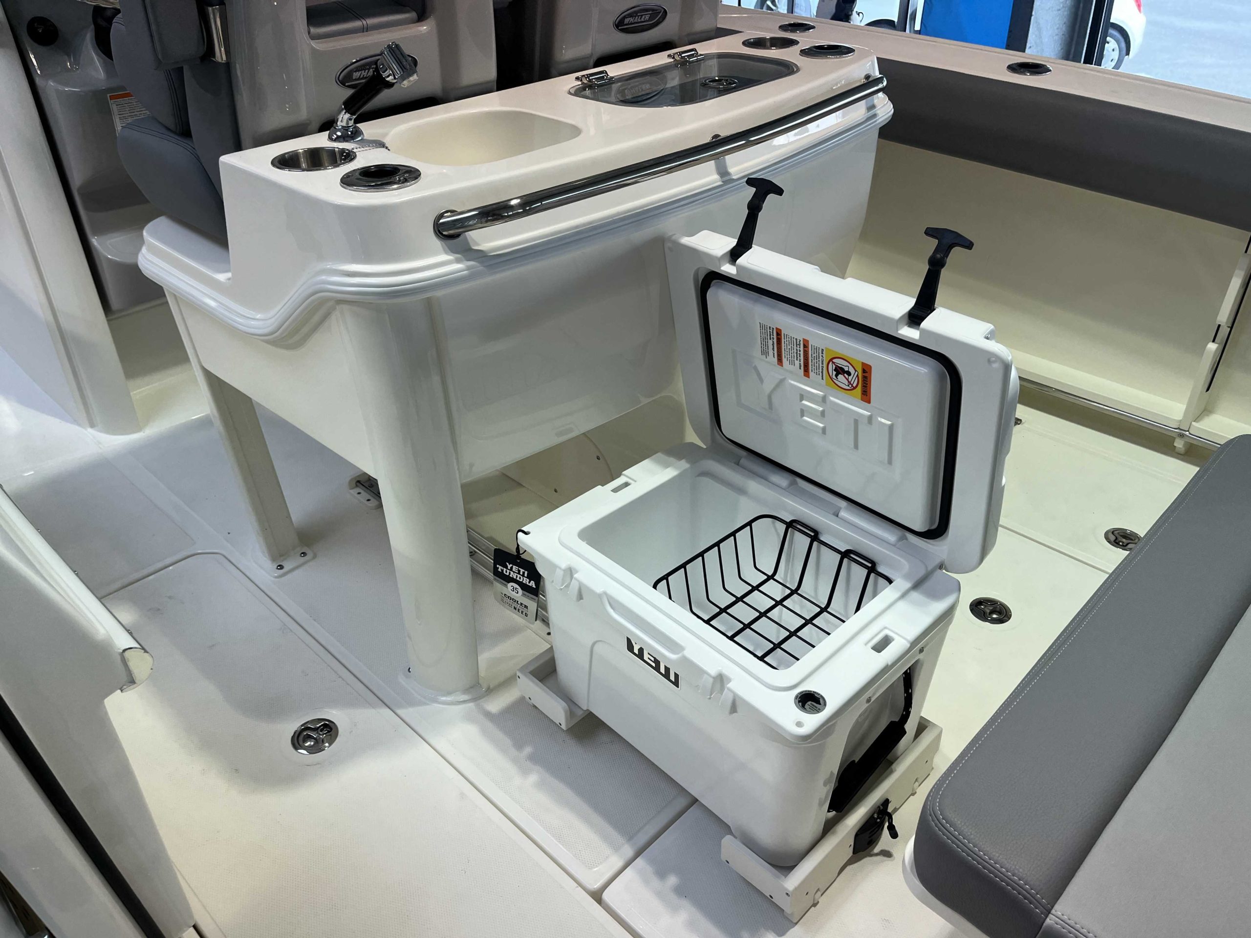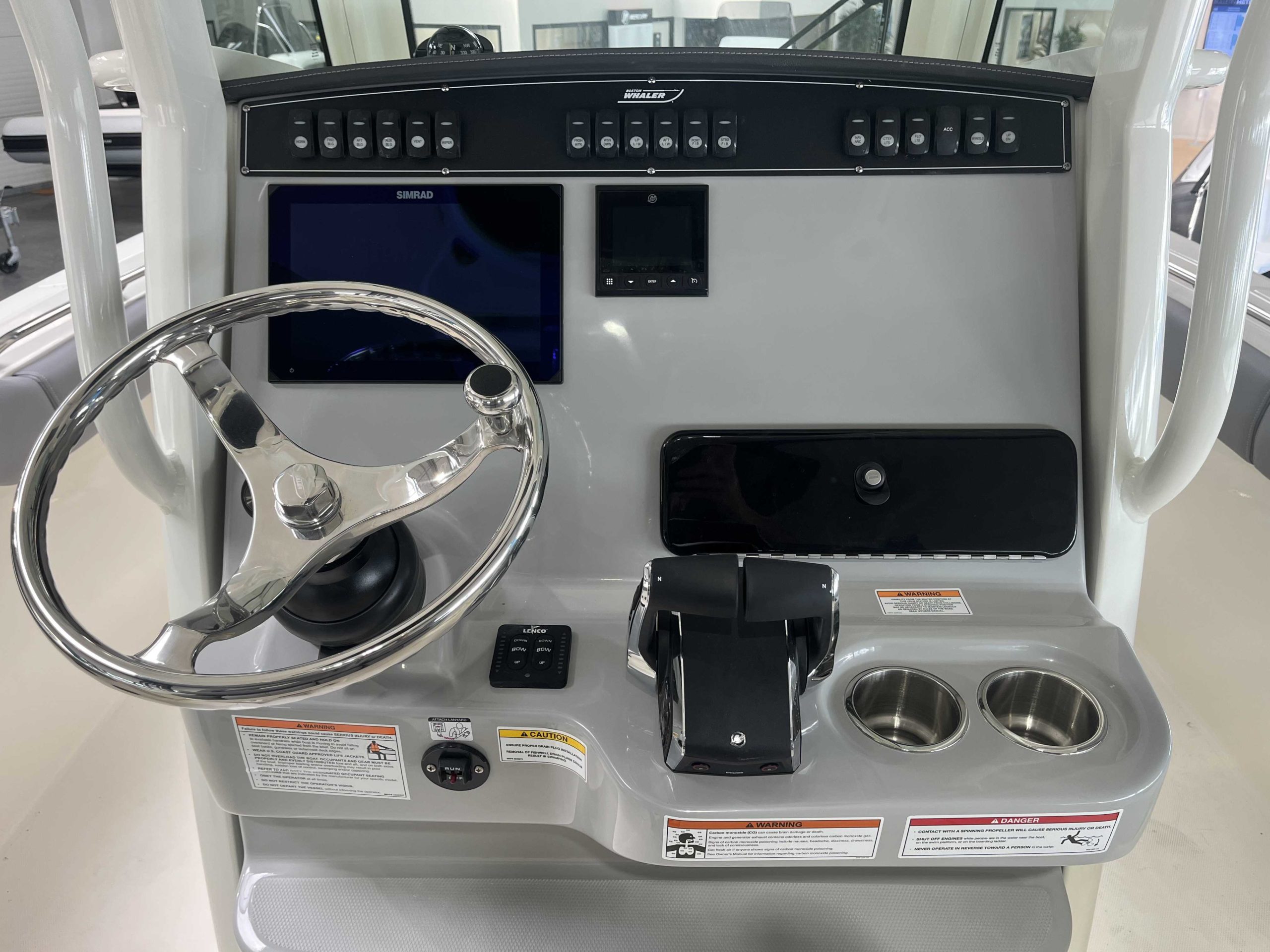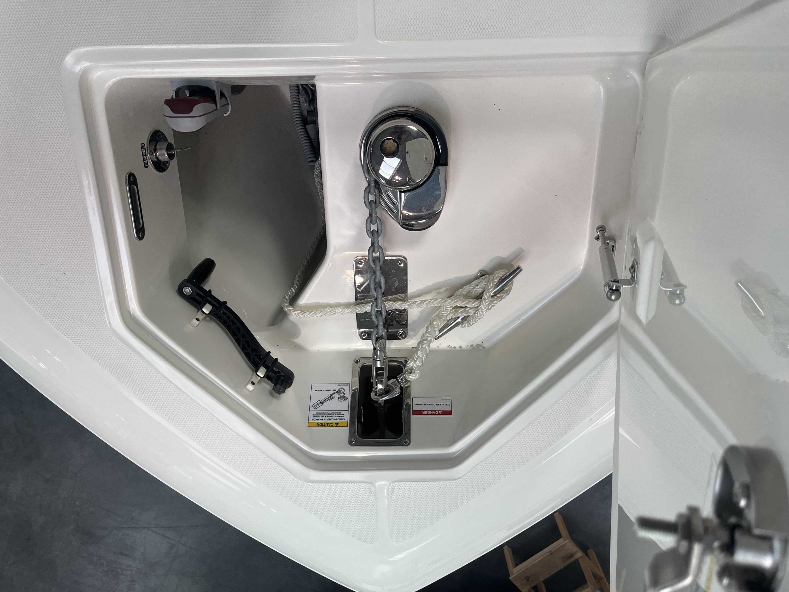 Anneau d'étrave, kit mouillage complet avec guindeau électrique chaîne et ancre inox, table de cockpit avant, premium package, leanning post deluxe avec glacière, vivier arrière babôrd, hardtop avec boitier électronique et essui glace, vesselview Mercury, système JL Audio, chargeur de batterie 220V, GPS Simrad NSX12 + sonde 3 en 1.